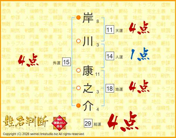 岸川康之介さんの総運は29画の4点!