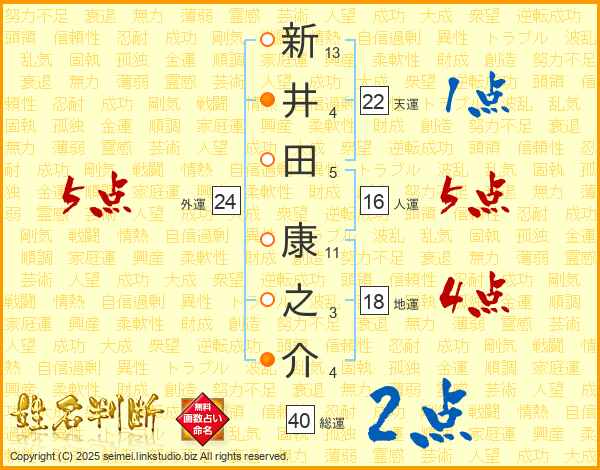 新(13画)井(4画)田(5画) 康(11画)之(3画)介(4画)