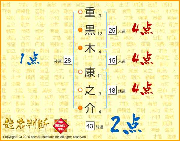 重(9画)黒(12画)木(4画) 康(11画)之(3画)介(4画)