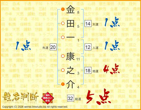 金(8画)田(5画)一(1画) 康(11画)之(3画)介(4画)
