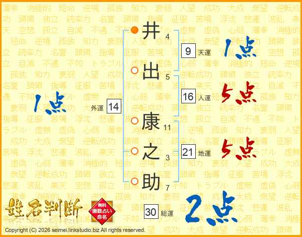 井(4画)出(5画) 康(11画)之(3画)助(7画)