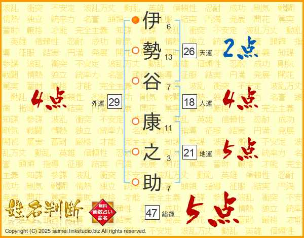 伊(6画)勢(13画)谷(7画) 康(11画)之(3画)助(7画)