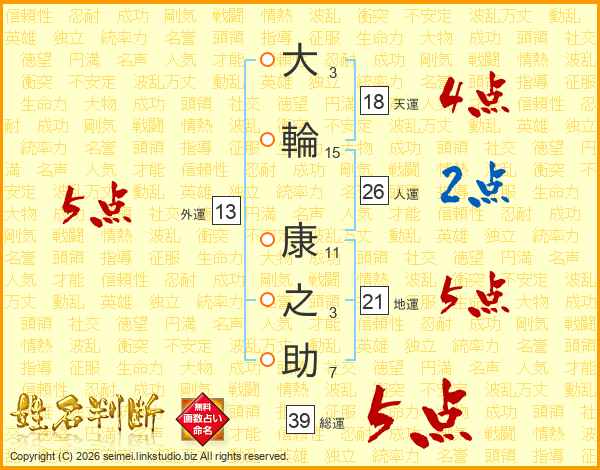 大(3画)輪(15画) 康(11画)之(3画)助(7画)