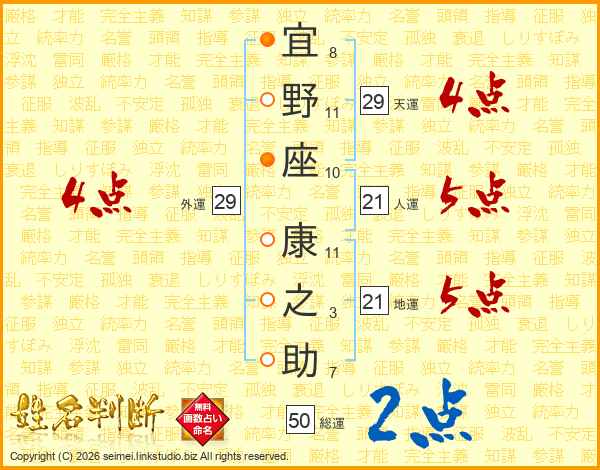 宜(8画)野(11画)座(10画) 康(11画)之(3画)助(7画)