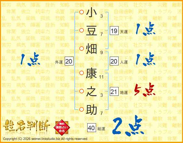 小(3画)豆(7画)畑(9画) 康(11画)之(3画)助(7画)