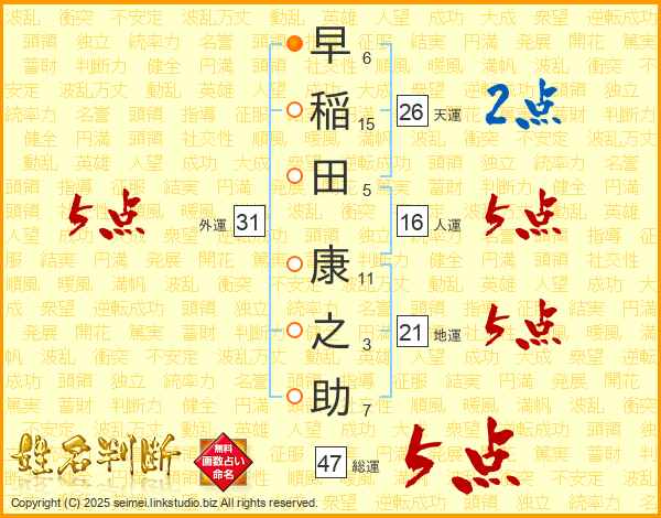 早(6画)稲(15画)田(5画) 康(11画)之(3画)助(7画)