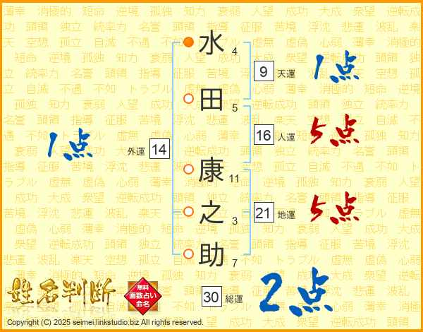 水(4画)田(5画) 康(11画)之(3画)助(7画)