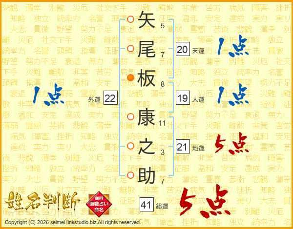 矢(5画)尾(7画)板(8画) 康(11画)之(3画)助(7画)