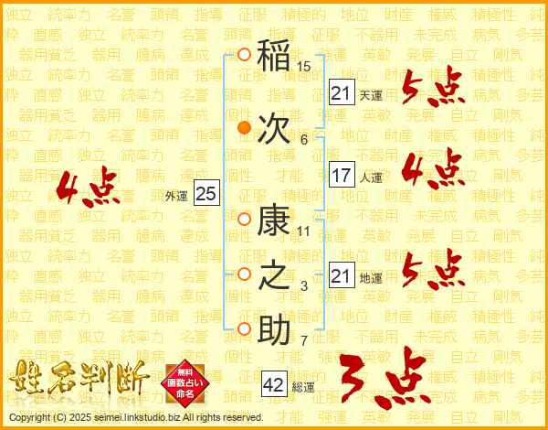 稲(15画)次(6画) 康(11画)之(3画)助(7画)