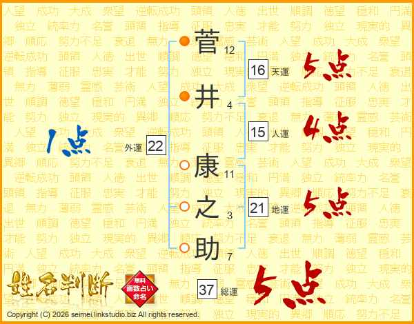 菅(12画)井(4画) 康(11画)之(3画)助(7画)