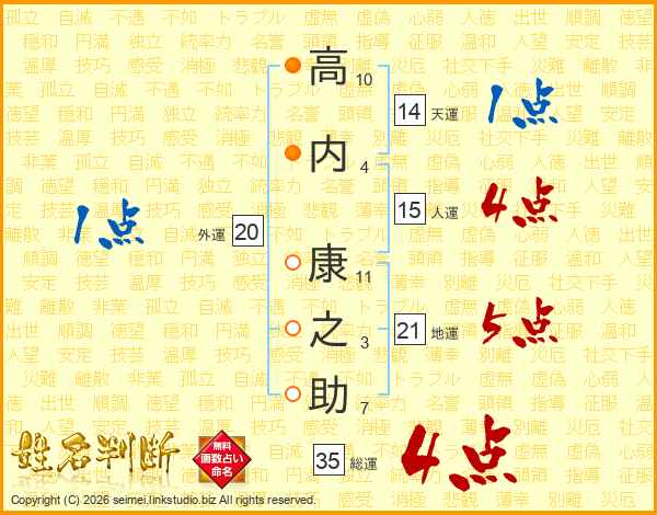 高(10画)内(4画) 康(11画)之(3画)助(7画)