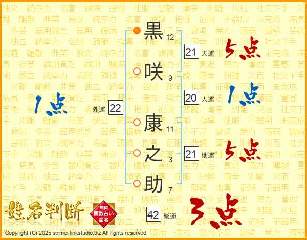 黒(12画)咲(9画) 康(11画)之(3画)助(7画)
