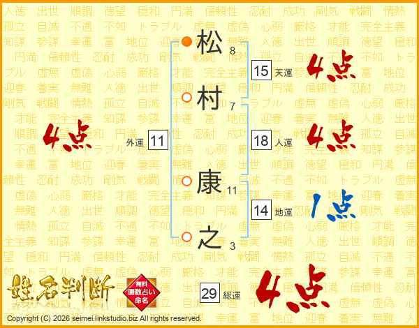 松(8画)村(7画) 康(11画)之(3画)