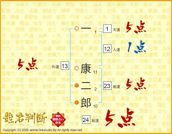 生活面を象徴する運勢です。外部から受ける影響力を表し、結婚運、家庭運や職場、環境への順応性を表します。総運から人運を引いた画数。姓や名が1文字の場合を除く。