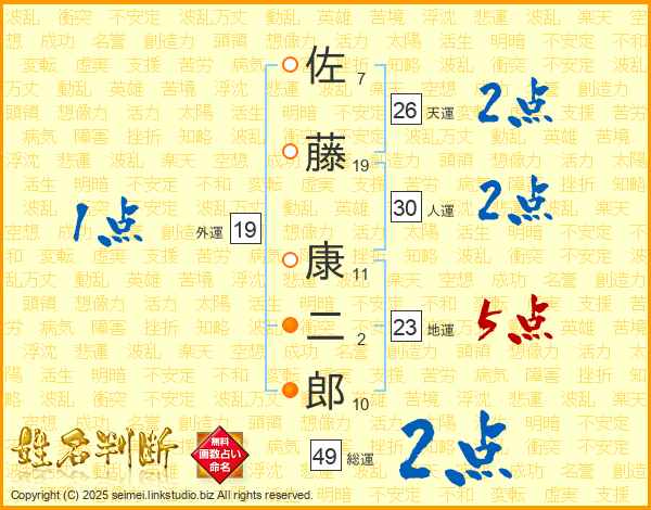 佐(7画)藤(19画) 康(11画)二(2画)郎(10画)
