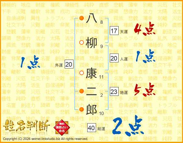 八(8画)柳(9画) 康(11画)二(2画)郎(10画)