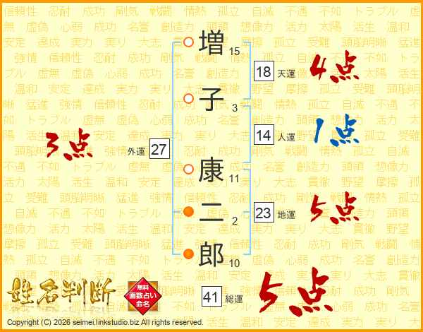 増(15画)子(3画) 康(11画)二(2画)郎(10画)