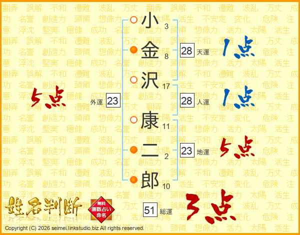 小(3画)金(8画)沢(17画) 康(11画)二(2画)郎(10画)