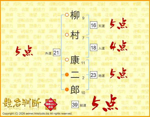 柳村康二郎さんの総運は39画の5点!