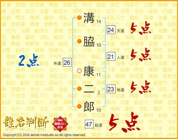 溝(14画)脇(10画) 康(11画)二(2画)郎(10画)