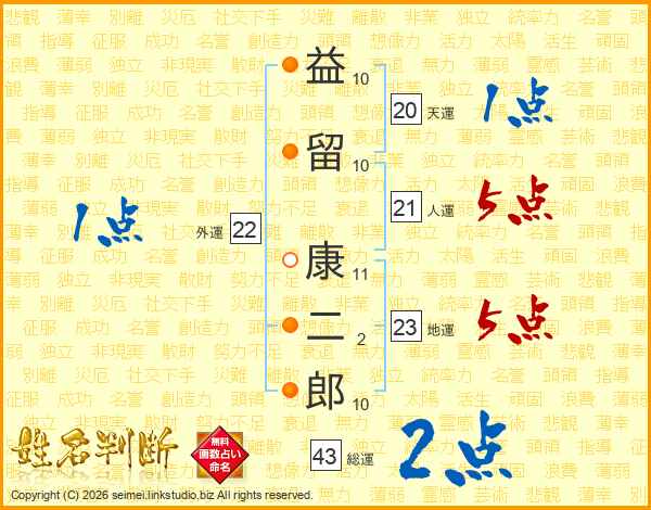 益(10画)留(10画) 康(11画)二(2画)郎(10画)