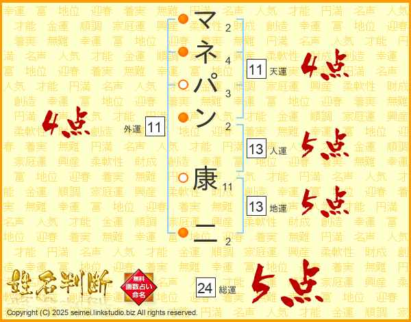 マ(2画)ネ(4画)パ(3画)ン(2画) 康(11画)二(2画)