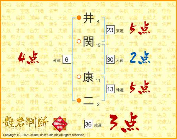 井(4画)関(19画) 康(11画)二(2画)
