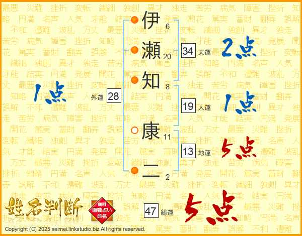 伊(6画)瀬(20画)知(8画) 康(11画)二(2画)