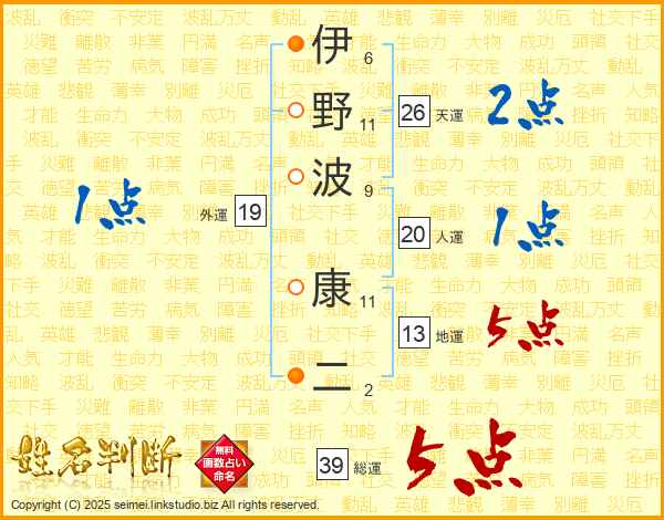 伊野波康二さんの総運は39画の5点!