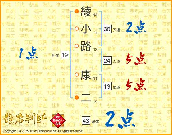 綾(14画)小(3画)路(13画) 康(11画)二(2画)