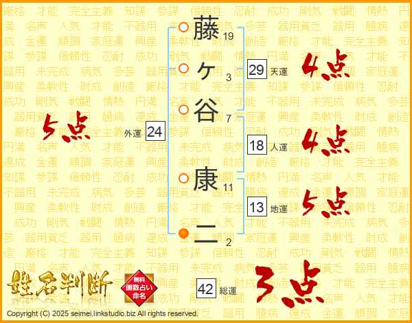 藤(19画)ヶ(3画)谷(7画) 康(11画)二(2画)