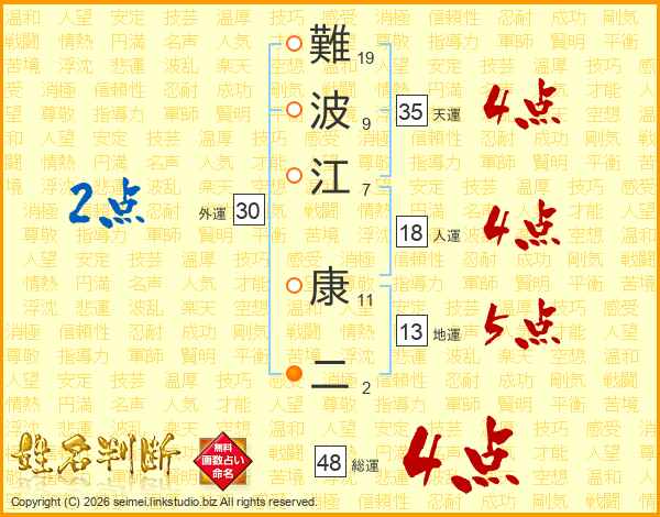 難(19画)波(9画)江(7画) 康(11画)二(2画)