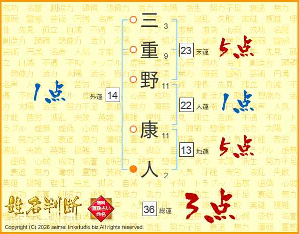 三重野康人さんの地運は13画の5点!