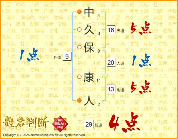 中(4画)久(3画)保(9画) 康(11画)人(2画)