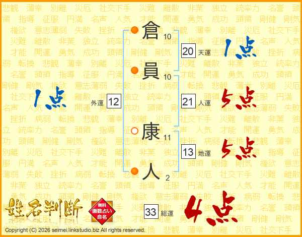倉員康人さんの総運は33画の4点!