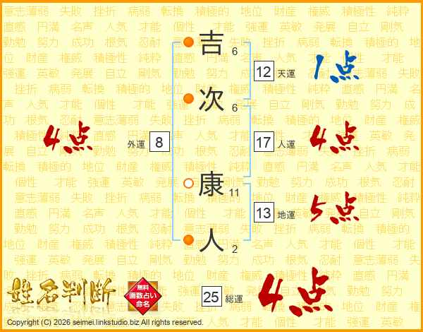 吉次康人さんの総運は25画の4点!
