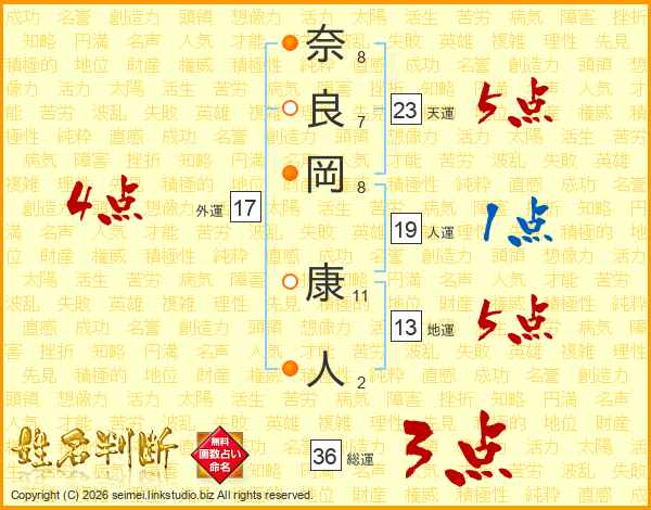 奈(8画)良(7画)岡(8画) 康(11画)人(2画)