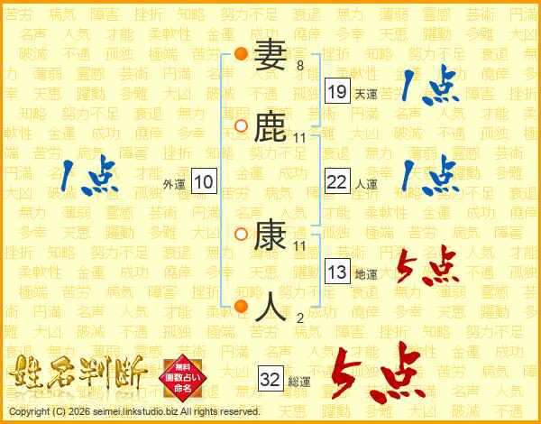 妻鹿康人さんの総運は32画の5点!