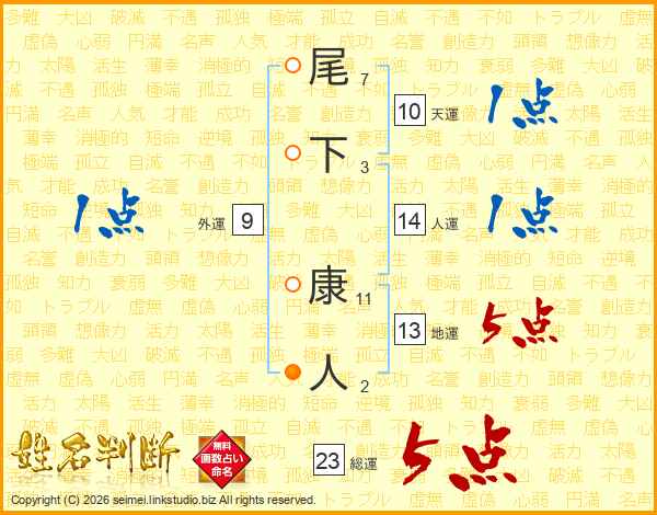尾下康人さんの総運は23画の5点!