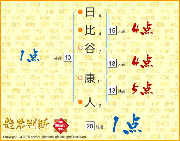 日(4画)比(4画)谷(7画) 康(11画)人(2画)
