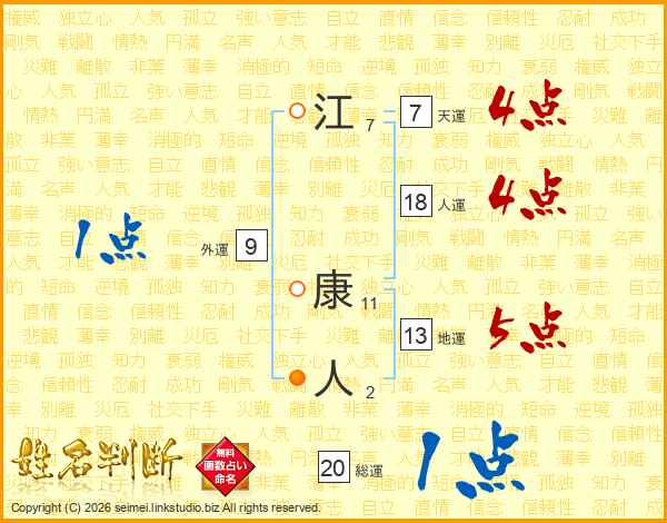 生活面を象徴する運勢です。外部から受ける影響力を表し、結婚運、家庭運や職場、環境への順応性を表します。総運から人運を引いた画数。姓や名が1文字の場合を除く。