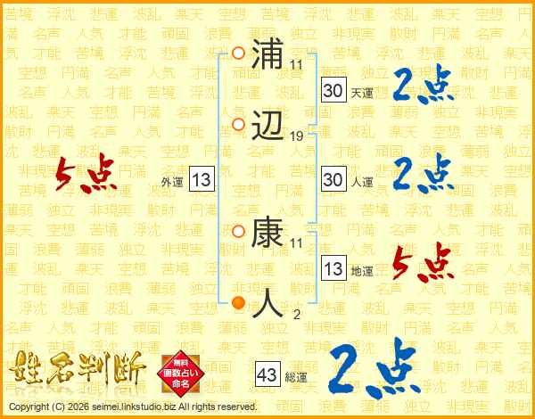浦辺康人さんの総運は43画の2点!