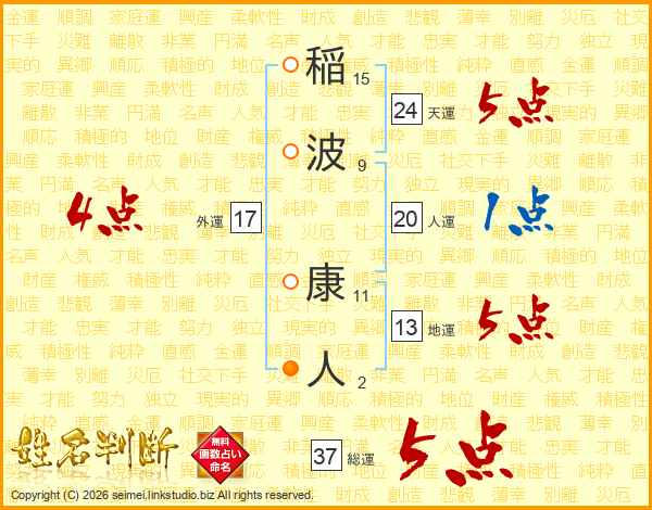 稲波康人さんの総運は37画の5点!