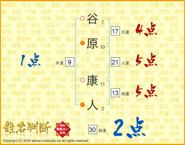 あなたの人生を表す1番重要な運勢です。生涯を通じて影響する総合運となり、主に50歳以降の晩年期に影響を及ぼします。苗字と名前の合計画数。