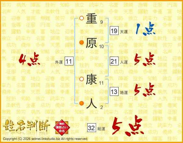 あなたの人生を表す1番重要な運勢です。生涯を通じて影響する総合運となり、主に50歳以降の晩年期に影響を及ぼします。苗字と名前の合計画数。