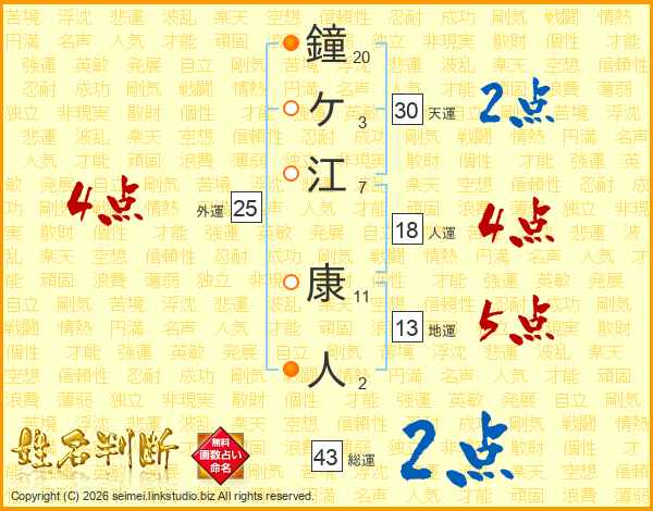 鐘ケ江康人さんの総運は43画の2点!