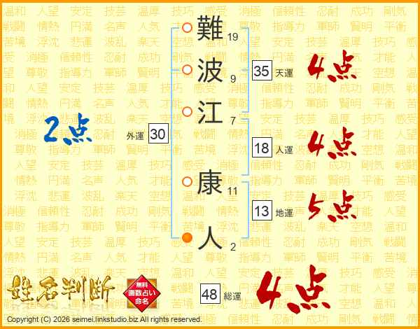 難(19画)波(9画)江(7画) 康(11画)人(2画)