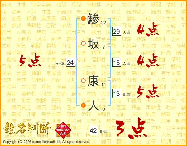 鯵坂康人さんの天運は29画の4点!