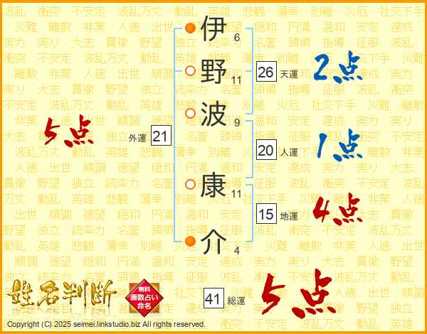 伊(6画)野(11画)波(9画) 康(11画)介(4画)