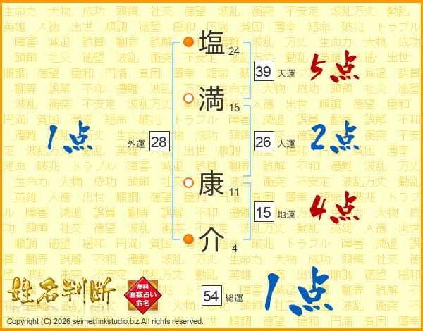 塩(24画)満(15画) 康(11画)介(4画)